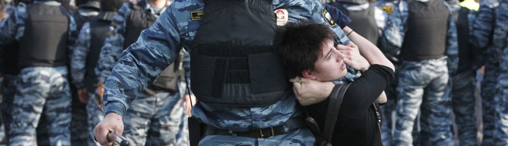 Russian riot police detain a protester during the “march of the million” opposition protest in central Moscow